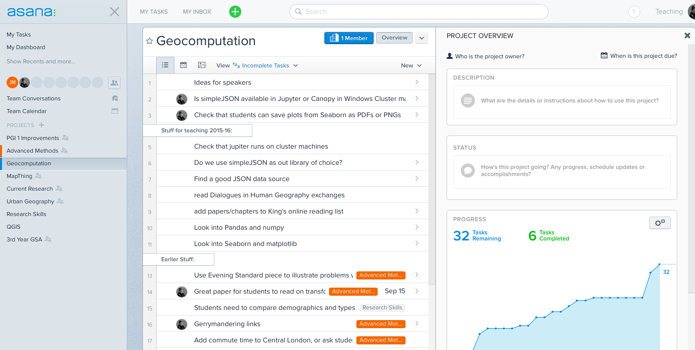 Asana is less obviously relevant for students, and here I’m using mainly for organising our thinking and planning on one of the departmental committees. We’ll see how well that goes, but early indications are pretty positive: no one has complained to me that the site was unusable or nonsensical, and I’m hoping that my colleagues will find it useful to have categorised ‘to do’ lists and a clearer understanding of who is working on what, and what issues are outstanding (e.g. unassigned or unresolved). So, with luck, it will again mean less email, more effective communication, and a higher level of ‘output’