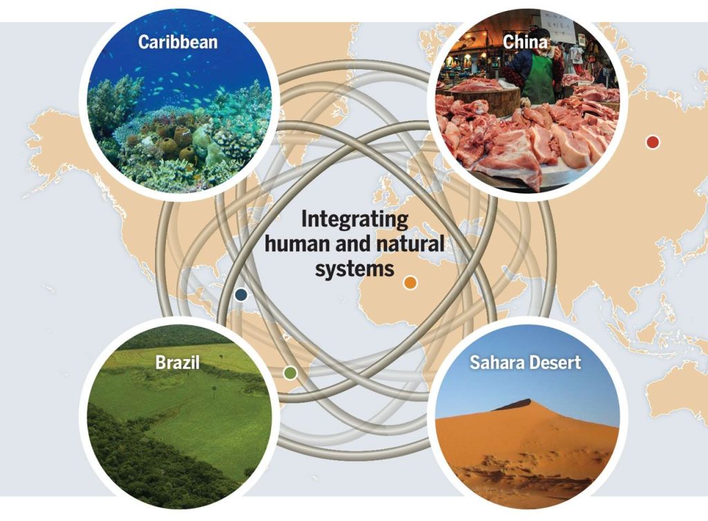 Telecoupling is the conceptual framework of socioeconomic and environmental interactions between coupled human and natural systems (e.g., regions, nations) over distances and across scales. Telecouplings take place through socioeconomic and/or biophysical processes such as trade, species invasions, and migration. For example, while a number of countries such as China have experienced a shift from net forest loss to net forest recovery, this forest transition has been often at the cost of deforestation in other countries, such as Brazil where forested land is converted to meet global food demands for soybean and beef.